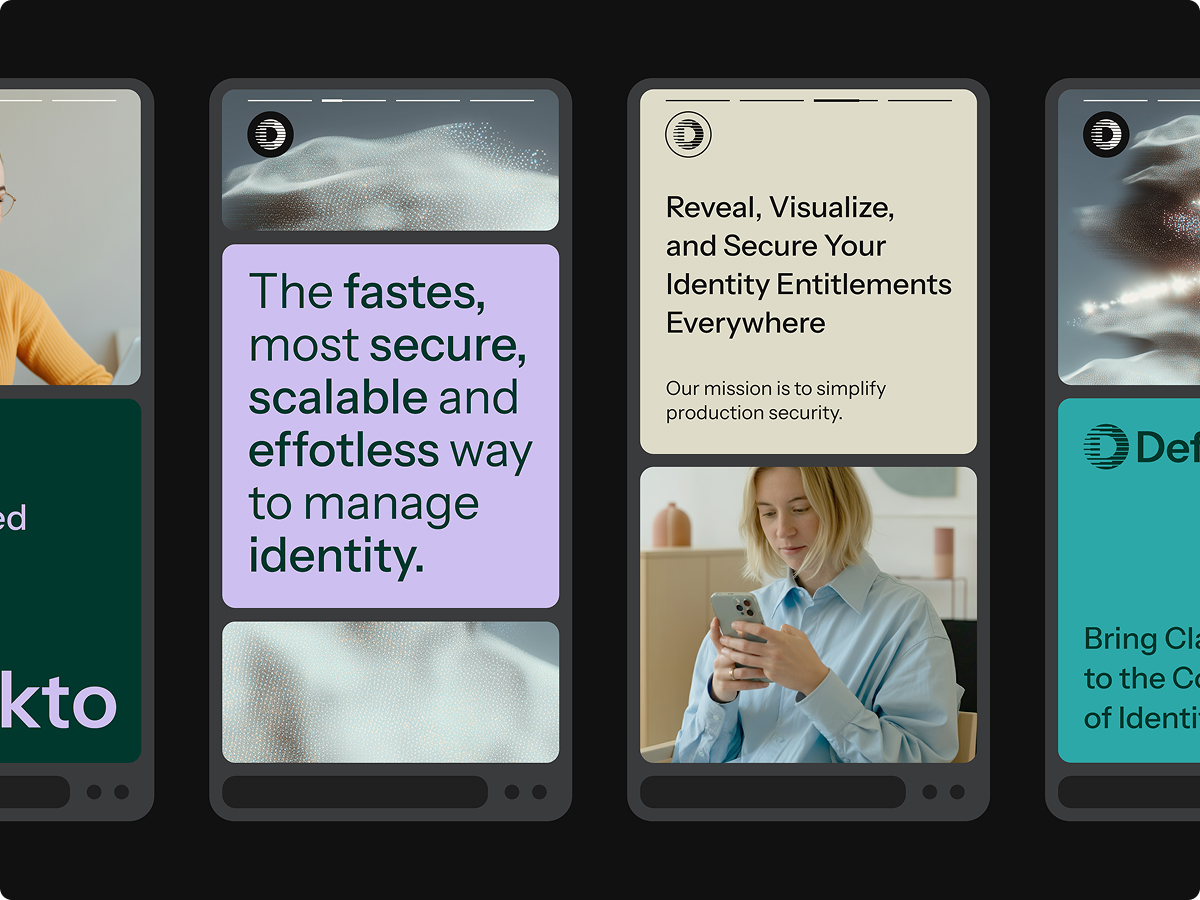 The custom WordPress website serves as the foundation of Defakto’s digital presence, featuring custom animations, thoughtful UX, and clear messaging that communicates complex security concepts. We also created a full suite of brand collateral including business cards, social media templates, and presentation decks that maintain consistency across all customer touchpoints.